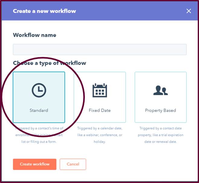 On the Workflow page, you'll be presented with three options. The Standard option is the most common which is triggered by a specific action versus a date or time (i.e. enrollment, joining a list or filling out a form).