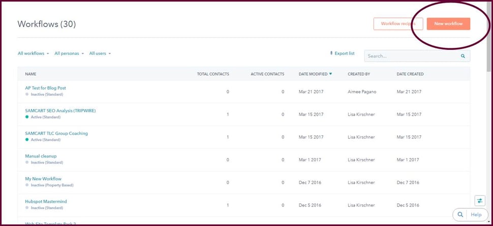 Once you've logged into Hubspot on the main Hubspot page, go to the top navigational menu and choose Contacts > Workflows.
