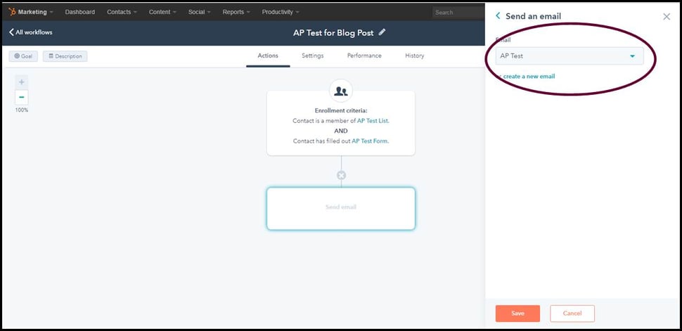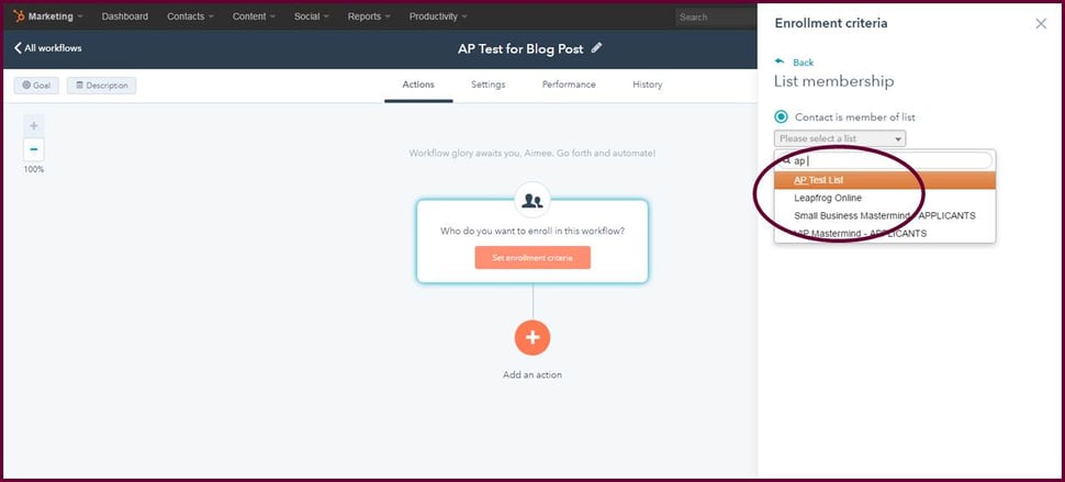 In the Workflow area, this is where you'll dictate how the workflow is going to be triggered. Under the Enrollment Criteria section, select the action that's going to trigger your workflow. The example below shows that I picked "List Membership". Specifically, I enrolled 'AP Test List'. This means anyone enrolled into the 'AP Test List' SmartList will be enrolled into the workflow. A SmartList could be anything depending on how create it. It could be anyone who downloaded a CTA off of your home page, for instance.