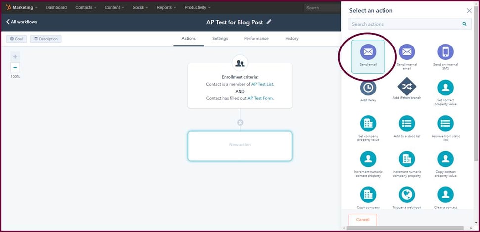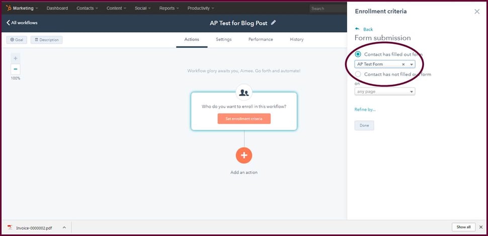 Once you've set your enrollment criteria, you'll want to indicate the 'Action' that's going to be taken once this enrollment criteria is met.