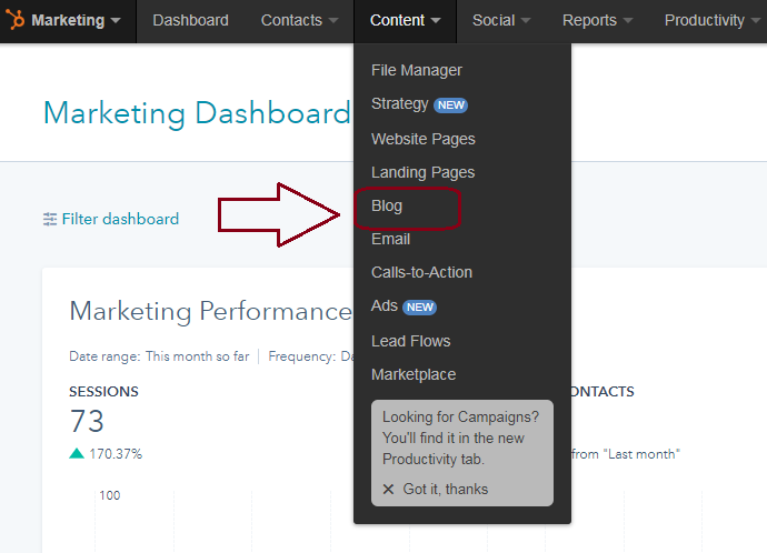 Once you’ve logged in to your HubSpot account, click the “Content” tab in the main navigation. Scroll down and click “Blog.”