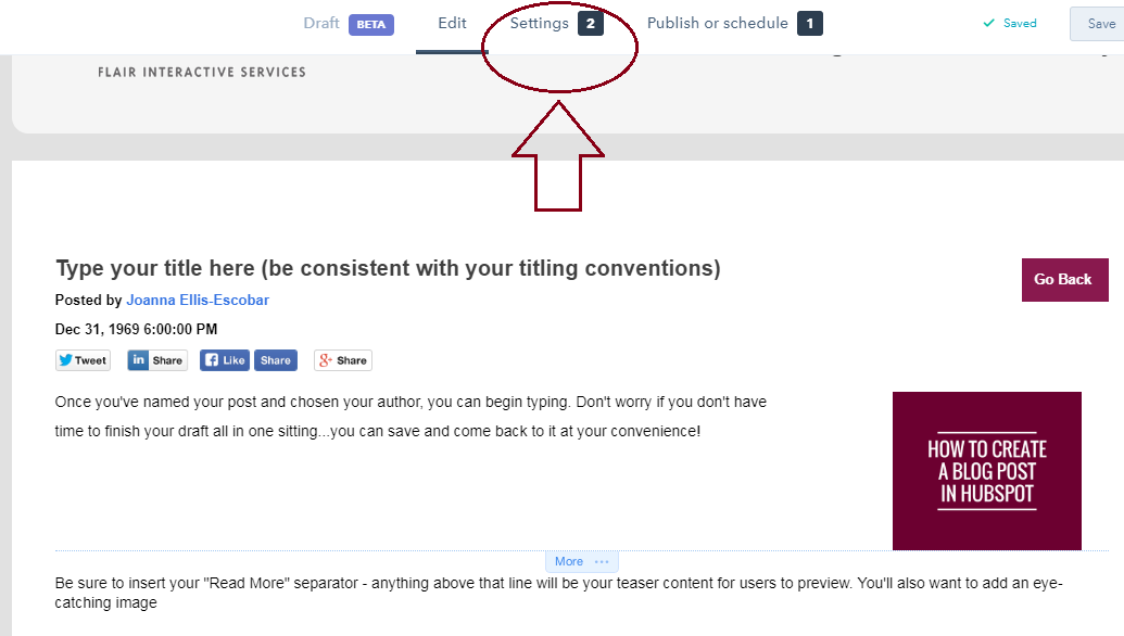 After you’re done composing your blog, you want to hop back over to the "Settings" tab.