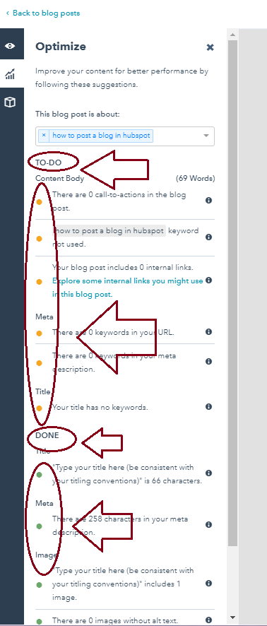 Once your keyword is in there, you’ll be able to check that you have done everything you need to do in order to post a successful, far-reaching blog that will attract your audience. You’ll probably have some items on the TO-DO list needing attention. That’s ok – just go back into your blog and make sure you address everything on the list.