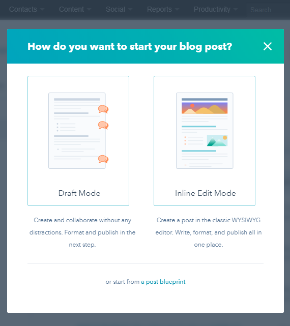 HubSpot makes this easy-as-pie with three blueprints you can start from. Blueprints are basically templated, pre-formatted posts that will give you a starting point while still allowing you edit and modify as needed. The current blueprint options are: