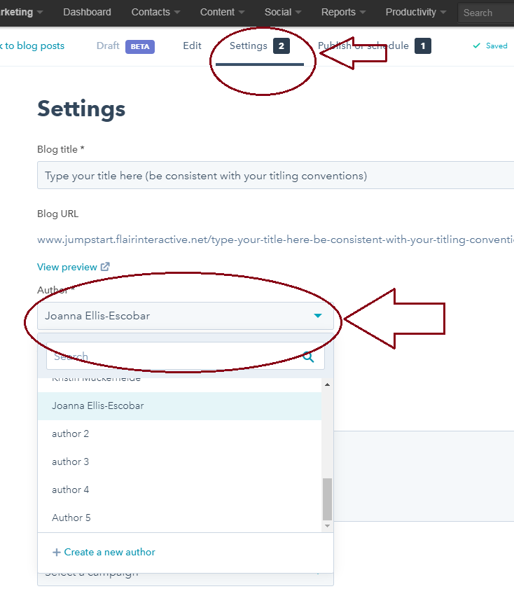 Hop over to the “Settings” tab and choose your author. This can be done with the dropdown tab that features all the authors who’ve been set up to blog. Don’t see your name? Creating an author is easy with the blue “+Create a new author” feature that shows up at the bottom of your list.