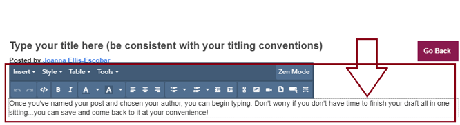Once you've named your post and have chosen your author, you can begin typing. Don't worry if you don't have time to finish your draft all in one sitting...HubSpot autosaves as you go, so you can come back to finish at your convenience.