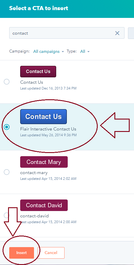 Choose the CTA you want to use and click Insert.