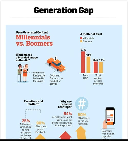 How Millennials and Baby Boomers Consume User-Generated Content—Understanding the generation you’re marketing to is as important as the product or service you're selling. From lifestyles, to principles, to buying habits, Millennials and Baby Boomers are on the most extreme ends of the consumer spectrum. This infographic does a great job of visually illustrating the true generational gap between these two very present buying groups.