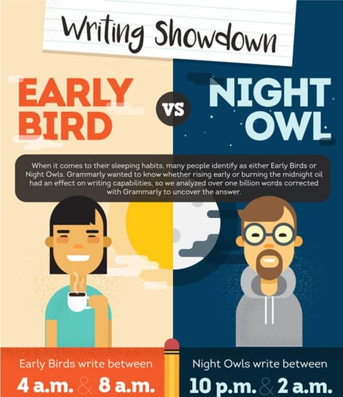 Writing Showdown: Early-birds vs Night-Owls—Conveniently, I wrote this blog in the ‘Early bird-ish’ hour. Hopefully that puts me on the lower end of the grammatical error scale. Particularly intriguing for writers, this infographic has some fun and helpful statistics about marketers and their finest writing hours.