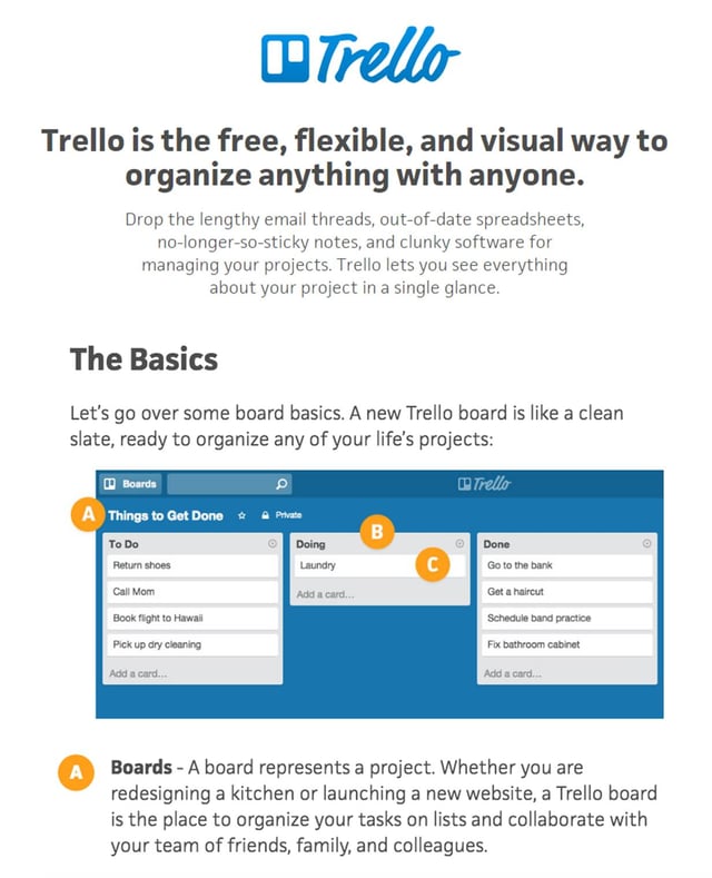 This project management tool takes direct and approachable to a new level. By describing how you can use their tool to manage everyday household tasks, Trello very clearly illustrates how the tool works. Of course, Trello's target audience knows the functionality of this tool can be utilized for far more complex scenarios, but it's still an excellent way to demonstrate a system that is inherently robust in a very simple way.