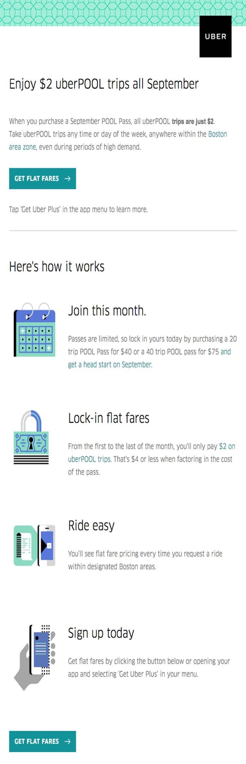While their vehicles may not always follow suit, Uber’s email campaigns are always clean and concise. This automated email is an excellent example. Through icons, headers and simple directives, the reader is easily guided through Uber's targeted offerings.